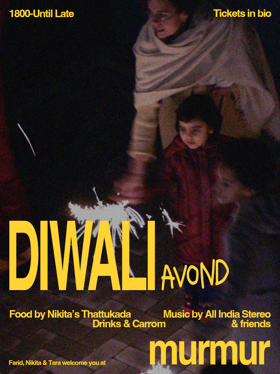 Diwali Avond was a gathering shaped around food, music, and shared ideas of home. Created by Farid, Nikita, and Tara, the event brought people together through taste, sound, and visuals for a communal Diwali celebration in Amsterdam. Hosted at Murmur, the evening featured biryani by Nikita’s Thattukada and music by All India Stereo, Vintage Voudou, and JEET, alongside stories and visuals reflecting the many meanings Diwali can hold.